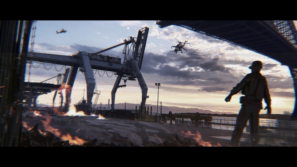 港口战火中的士兵与直升机4K壁纸
