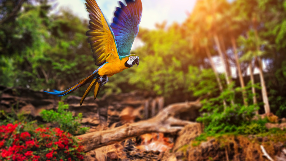 彩虹鹦鹉飞翔旴热带雨林4K壁纸